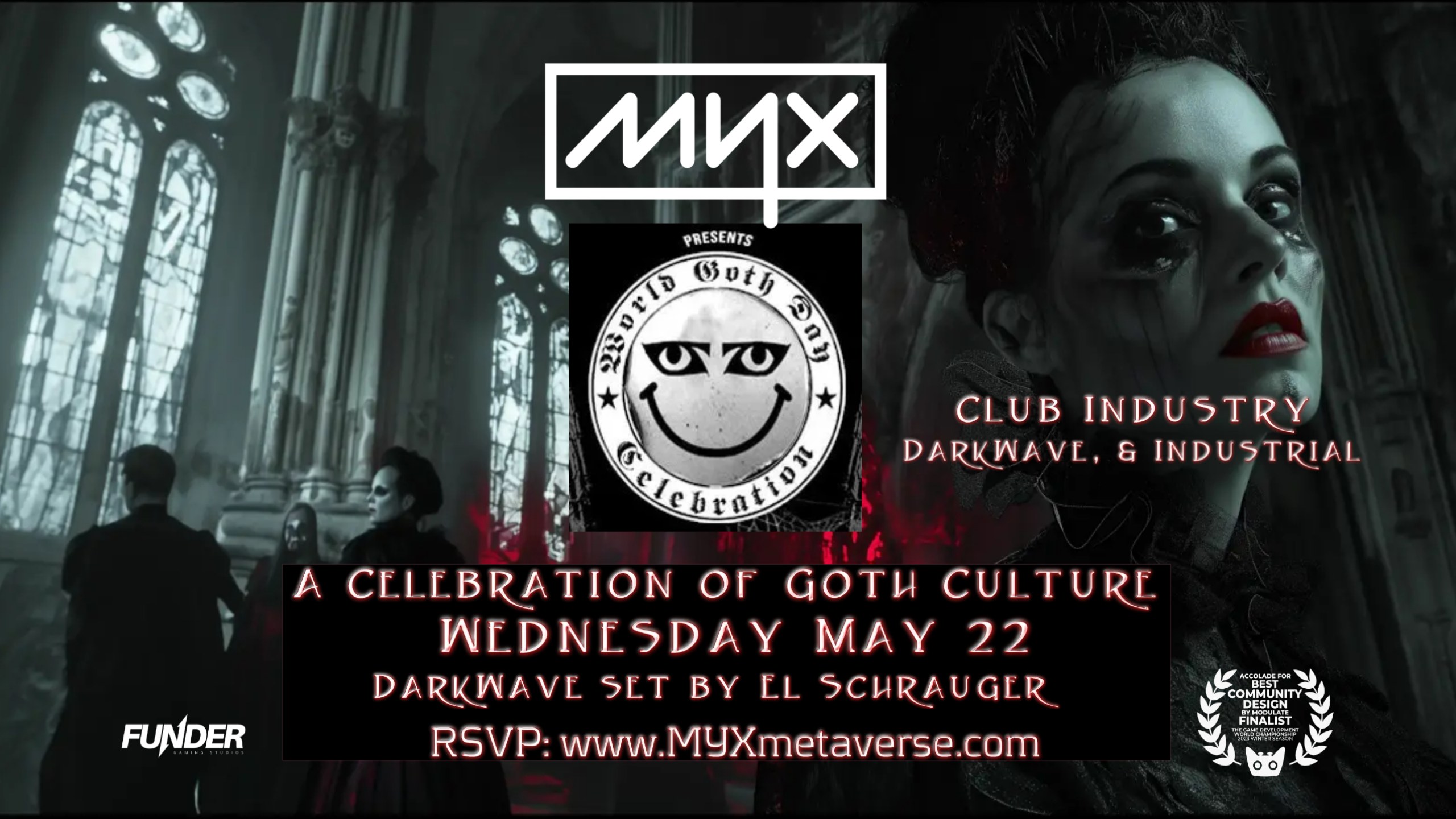 Greetings, fellow creatures of the night, As the shadows grow long and the veil between worlds thins, it is my pleasure to invite you to a dark celebration. On May 22nd, we gather to honor World Goth Day in the enigmatic realm of MYX Metaverse, a sanctuary for the dark-hearted and the dreamers. Join us at Club Industry, where the walls echo with the whispers of forgotten souls and the air is thick with anticipation. The night will be graced by an extraordinary dark wave set from the one and only El Schrauger. His beats, both haunting and ethereal, promise to transport you to a world where the mundane and the magical collide. This night is not merely an event; it is a gathering of kindred spirits, a communion of those who find beauty in darkness and solace in the shadows. Together, let us dance under the moonlight, celebrate our uniqueness, and revel in the music that binds us. Whether you are an elder of the scene or a baby bat, all are welcome to partake in this nocturnal revelry. Mark your calendars, spread the word, and prepare for a night to remember. World Goth Day at MYX Metaverse awaits you.
