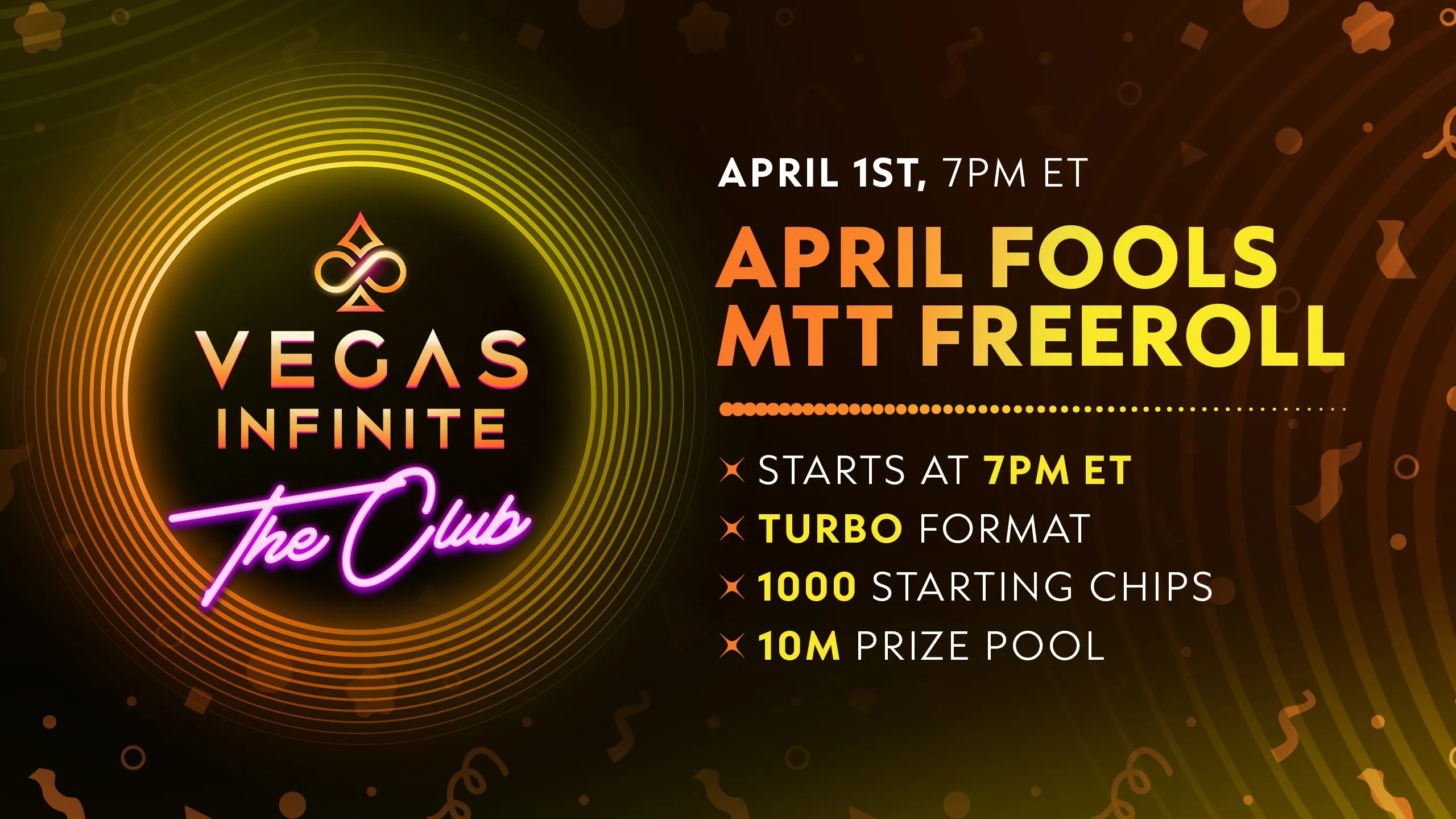The April Fools' Day Club-exclusive multi-table tournament in Vegas Infinite is right around the corner, and the pot is overflowing with a whopping 10,000,000 chip prize pool!