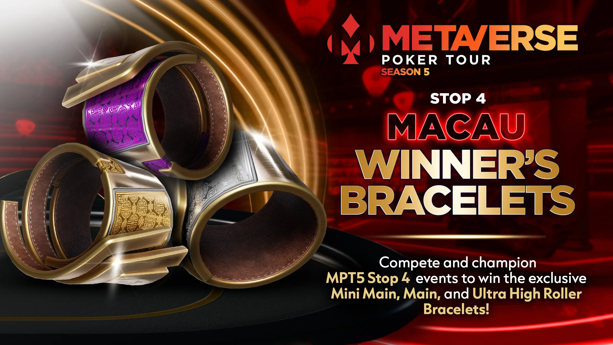 The Metaverse Poker Tour Season 5: Macau Ultra High Roller Event is a 100,000,000 chip buy-in multi-table tournament that starts Sunday, February 1st at 4PM ET. Compete for the chance to win huge chip prizes, and an exclusive MPT bracelet!