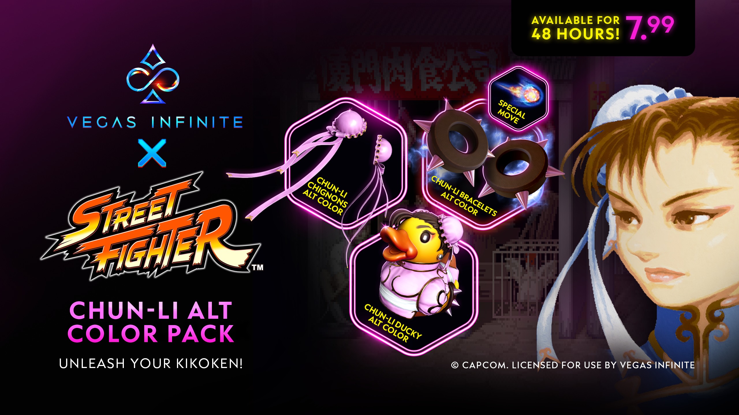 Introducing the limited-time edition Alternate Color Packs for Ryu and Chun-Li in Vegas Infinite! These packs feature officially recolored content to refresh your gaming experience. Chun-Li's pink recolor adds charm to her chignons, bracelets, and ducky, while Ryu's gold headband, black and gold ducky, and brown gloves elevate his style. Act fast - available for just 48 hours until Friday, February 9th at 9 AM EST for 7.99 each. Don't miss out, grab yours now!