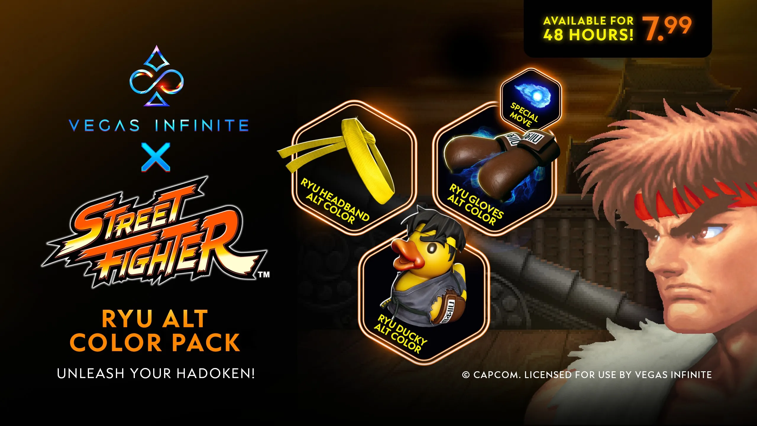 Introducing the limited-time edition Alternate Color Packs for Ryu and Chun-Li in Vegas Infinite! These packs feature officially recolored content to refresh your gaming experience. Chun-Li's pink recolor adds charm to her chignons, bracelets, and ducky, while Ryu's gold headband, black and gold ducky, and brown gloves elevate his style. Act fast - available for just 48 hours until Friday, February 9th at 9 AM EST for 7.99 each. Don't miss out, grab yours now!