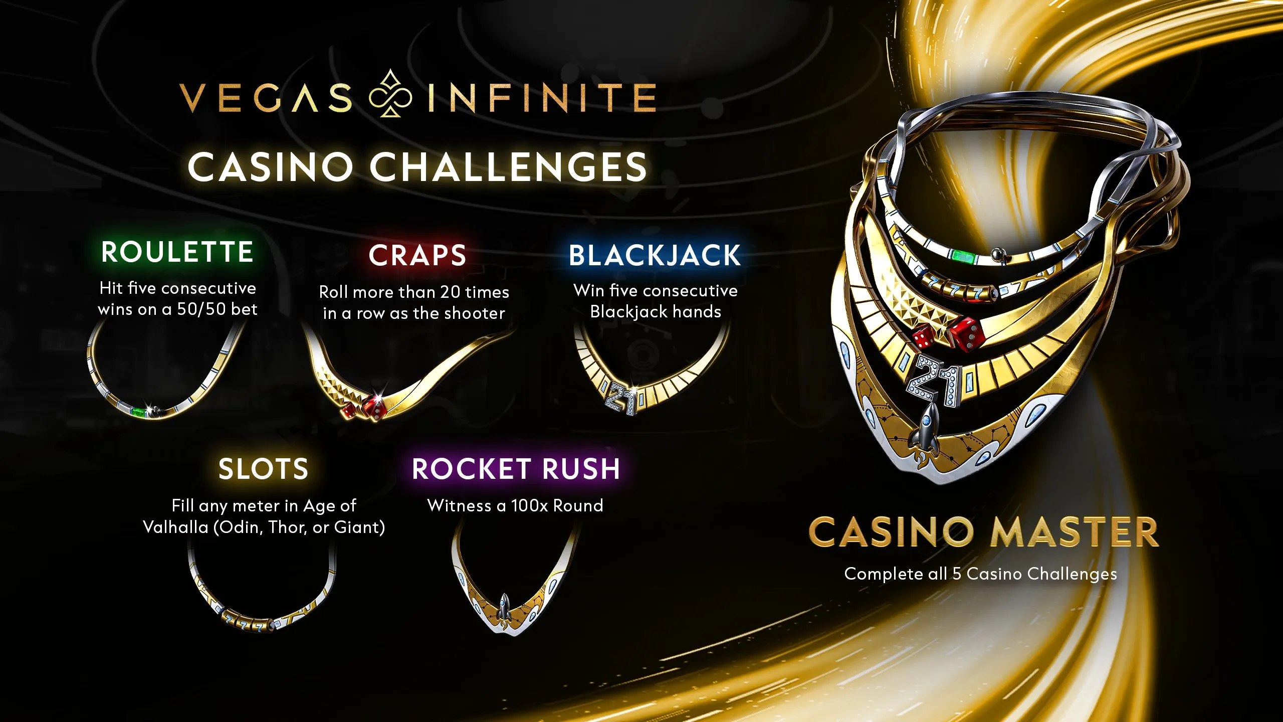 Take part in the latest additions to our Casino Challenges! Fill any meter in Age of Valhalla (Odin, Thor, or Giant) and experience a thrilling 100x round on Rocket Rush to earn an exclusive Casino-themed necklace for each game mode. Claim the reward for every gamemode to receive the prestigious Casino Master necklace, showcasing your casino prowess! Get ready to hit the tables, and may luck be on your side. Enjoy the excitement