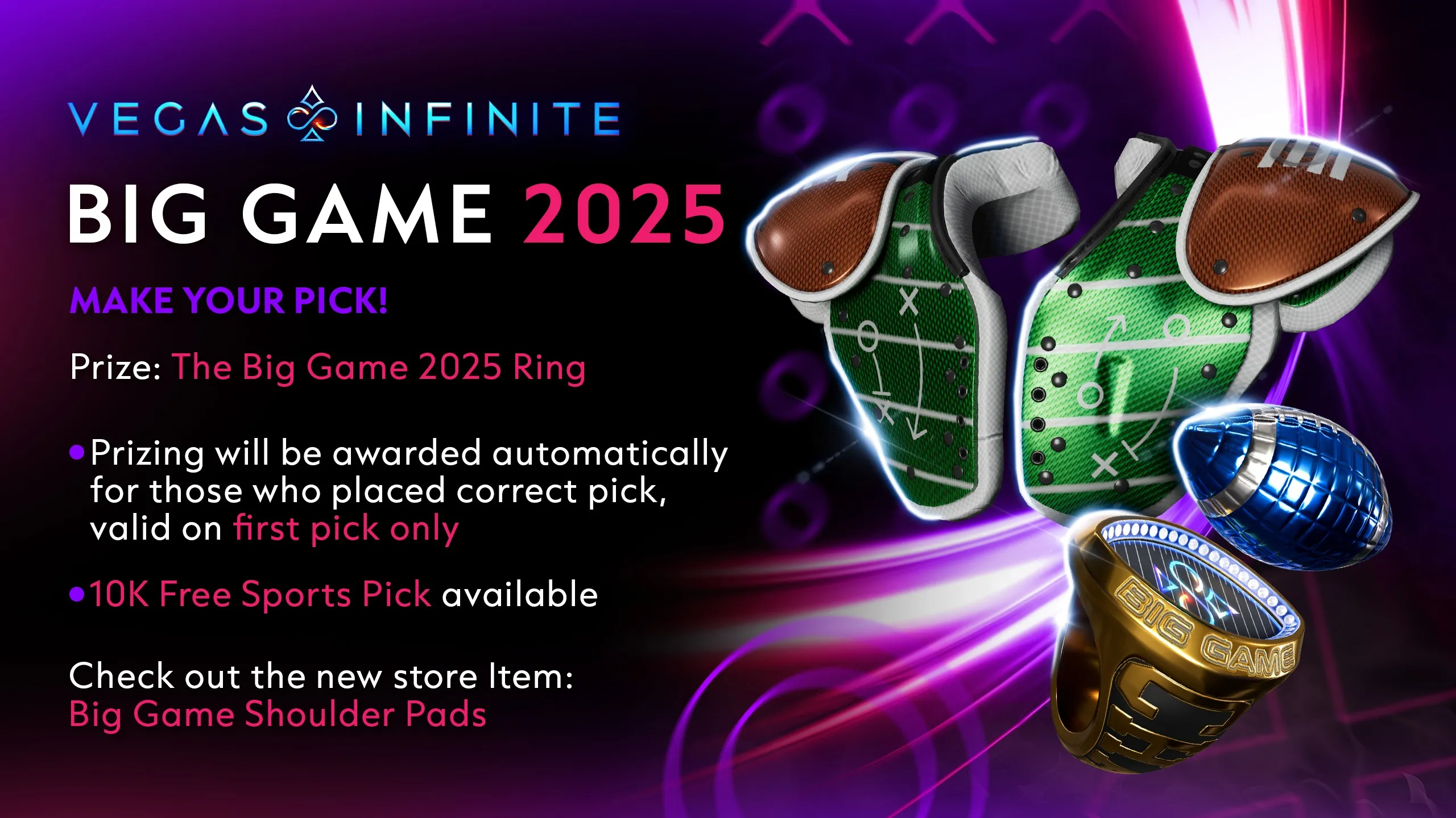 The stage is set! Kansas City vs. Philadelphia! Think you know who will take the trophy? Make your prediction, and if you pick the winning team, you’ll score the exclusive 2025 Big Game Ring! But choose wisely because only your first guess counts! To help you lock in your pick, we are giving you a FREE 10K Sports Ticket. Use it to place your pick and may luck be on your side! Gear up for the action with the all-new Big Game Shoulder Pads, dropping tonight in the store for 1,100 Creds, along with a lineup of football-themed goodies to get you game-day ready. Lock in your pick, grab your gear, and get ready for an unforgettable Big Game this weekend!