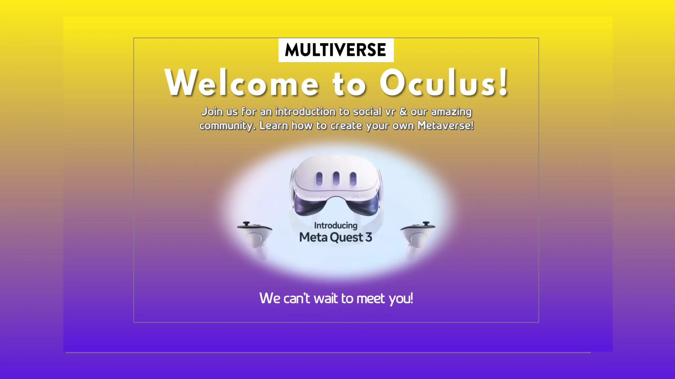 Welcome to the incredible world of Virtual Reality! Multiverse is a remarkable social metaverse app that you can download and enjoy for free! Our community is full of amazing people, and there are countless places to explore such as stores, galleries, and districts. Plus, we regularly host events where you can connect with like-minded individuals and make new friends. During this event, we will guide you through the process of building your very own metaverse step by step. With our drag and drop tools, you'll be able to customize your metaverse to your heart's content. Additionally, we'll teach you how to navigate through the virtual world using JetPacks. We are excited to meet you and help you get acquainted with your new headset. See you soon!