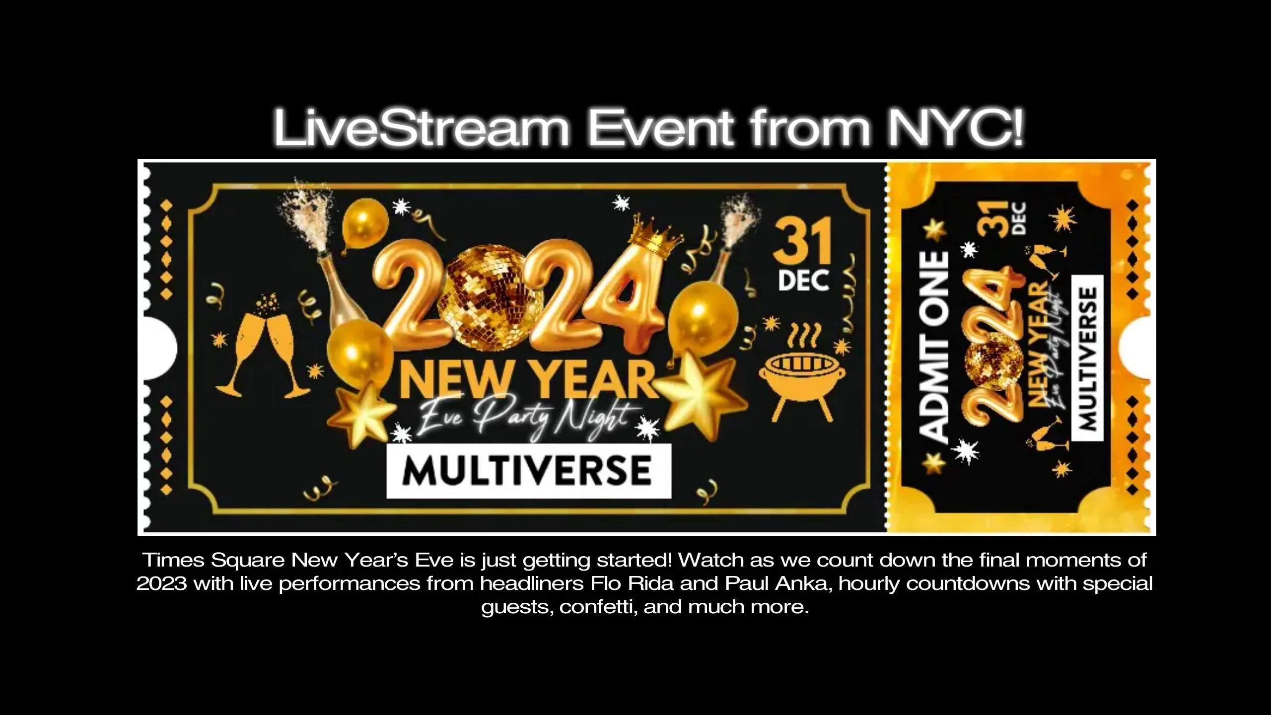 You're Invited! Join is in Multiverse - Times Square New Year’s Eve is just getting started! Watch as we count down the final moments of 2023 with live performances from headliners Flo Rida and Paul Anka, hourly countdowns with special guests, confetti, and so much more. Let's ring the new year in together in our fantastic community!