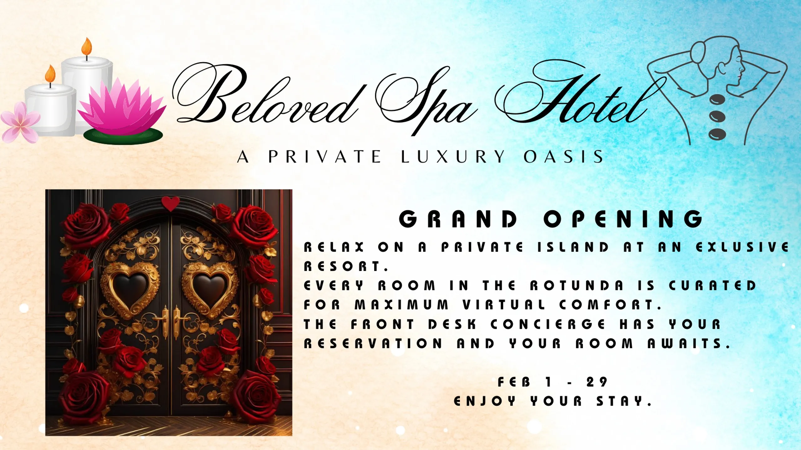 Beloved Canyon welcomes you to a private spa hotel that offers the best in virtual relaxation. This private island Hotel has several room to take your senses to another level. Just tell your watch 'BELOVED SPA HOTEL'. Enjoy.