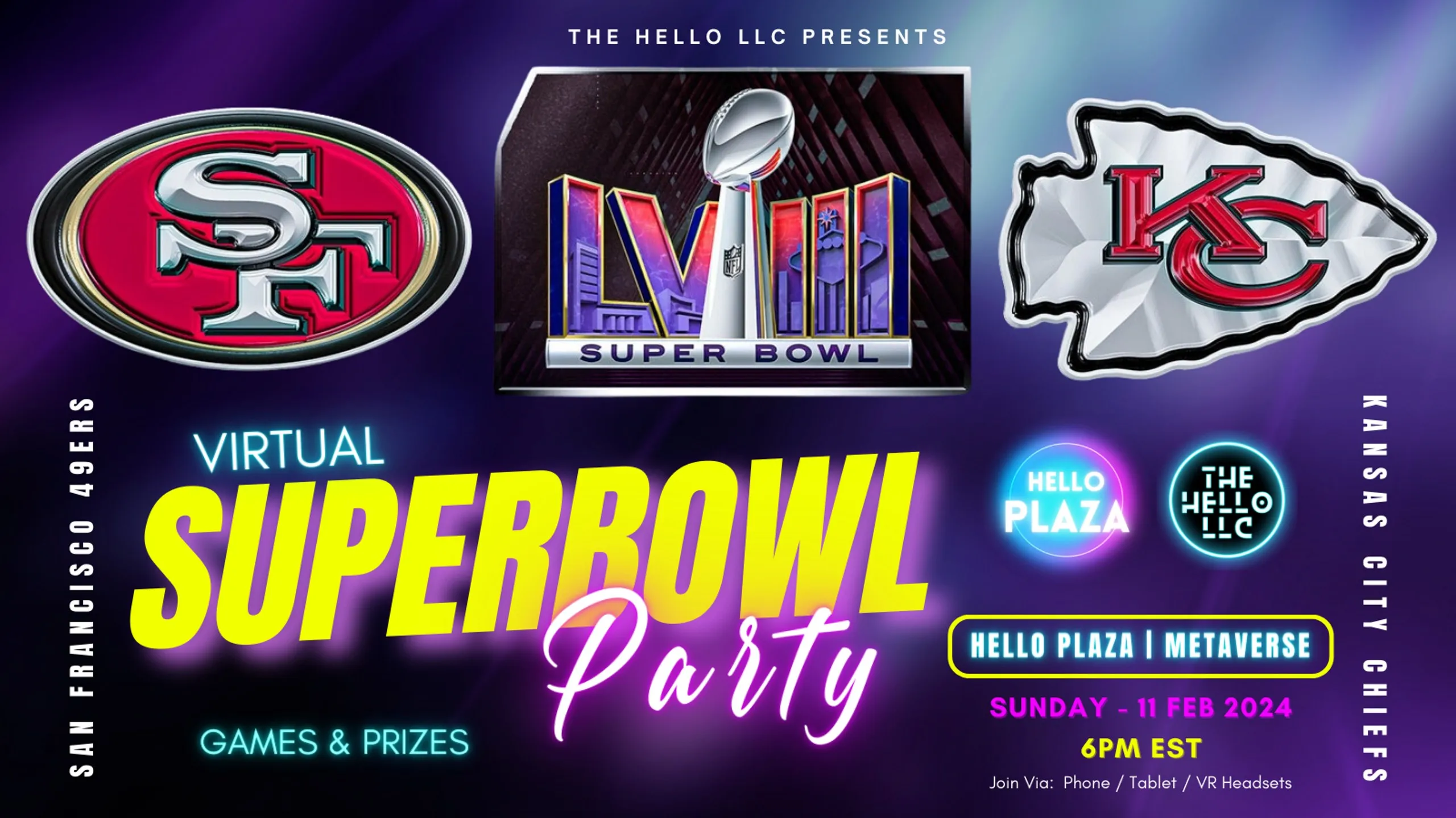 Touchdown ... Calling all pigskin prophets, dip dabblers, and touchdown titans! You're Invited to a Virtual Super Bowl Showdown between the San Francisco 49ers and the Kansas City Chiefs! Join us for a good time at the Hello Plaza Virtual Super Bowl Party on February 11th, 6 PM EST. Forget chips and stale dips on the couch - this celebration is bursting with: Gridiron Games: Put your skills to the test with Super Bowl bingo, commercial parodies, and more! Prize Powerhouse: Score epic prizes and bragging rights with exciting giveaways throughout the night. Community Connection: Cheer on your team (or just the commercials!) with fellow football fanatics from the comfort of your own home. It's the perfect blend of game-day spirit and virtual fun. So grab your jersey (or pajamas, we don't judge!), fire up your screen, and get ready for a touchdown of a good time! See you there - You Don't Want To Miss This PARTY!!!