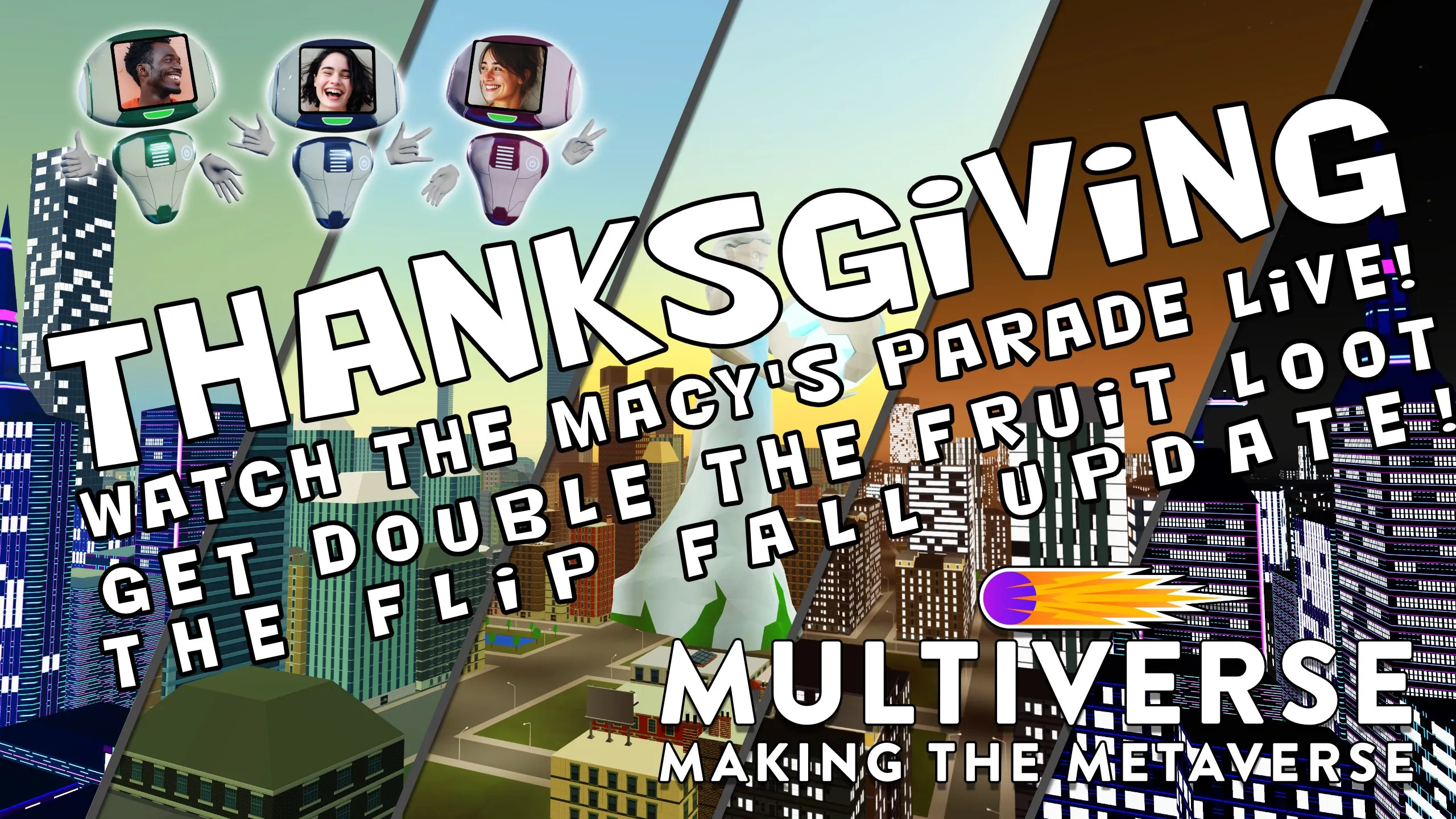 🦃✨ Thanksgiving Fest in the Multiverse! 🥧🍂 Get ready to gobble up the fun this Thanksgiving! Join us for a heartwarming celebration packed with festive vibes, awesome company, and plenty of gratitude to go around. 🌟 Let’s make memories and share laughs in our amazing virtual world! 💞 🎉 Bonus Alert 🎉 Don’t miss out on the Thanksgiving & Black Friday Double Fruit Loot! 🍎🍇 Double the rewards, double the excitement—collect as many as you can! 🏃♀️💨 Let’s feast, find, and have a blast together! See you there!