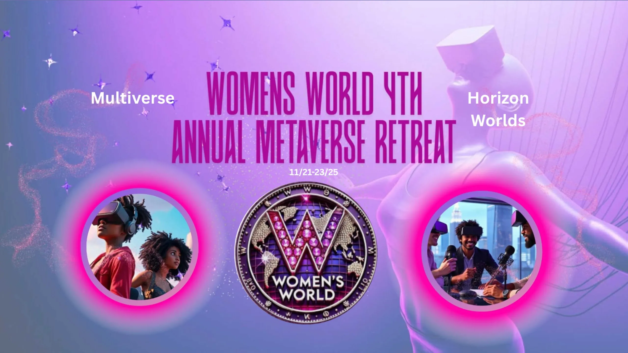The Women’s World 4th Annual Metaverse Retreat—The Metaverse Experience—is a groundbreaking celebration of creativity, innovation, and human connection in virtual reality. This year’s retreat brings together men and women to showcase their VR builds, brands, podcasts, live performances, galleries and more through live world tours, immersive networking, and interactive showcases.